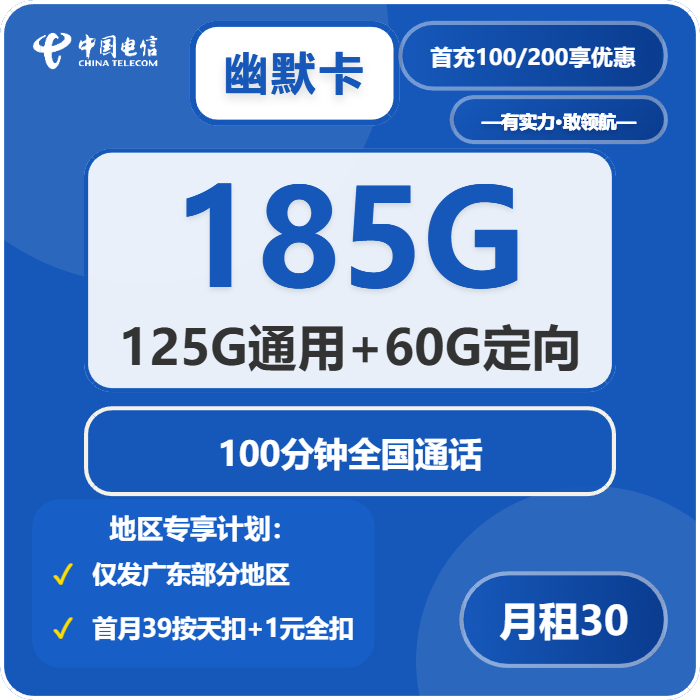 1)电信幽默卡30元包125G通用+60G定向+100分钟通话,合约2年,归属地广东,办卡年龄18-70周岁,线下上门配送,仅发深圳 广州 惠州 佛山 东莞 中山, 线下派送, 激活强充100/200。