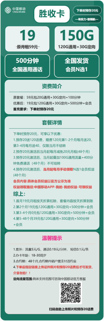 胜收卡定位为“长期合约+大流量+大语音”的组合型套餐,核心资源为150G流量(通用为主)与500分钟全国通话,同时附带会员N选1权益。